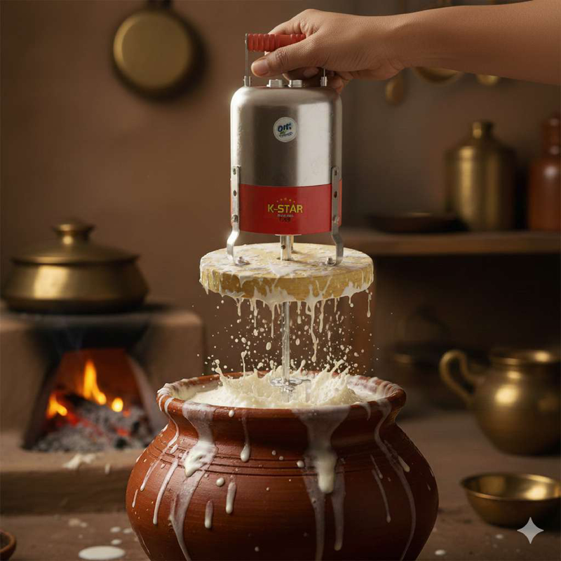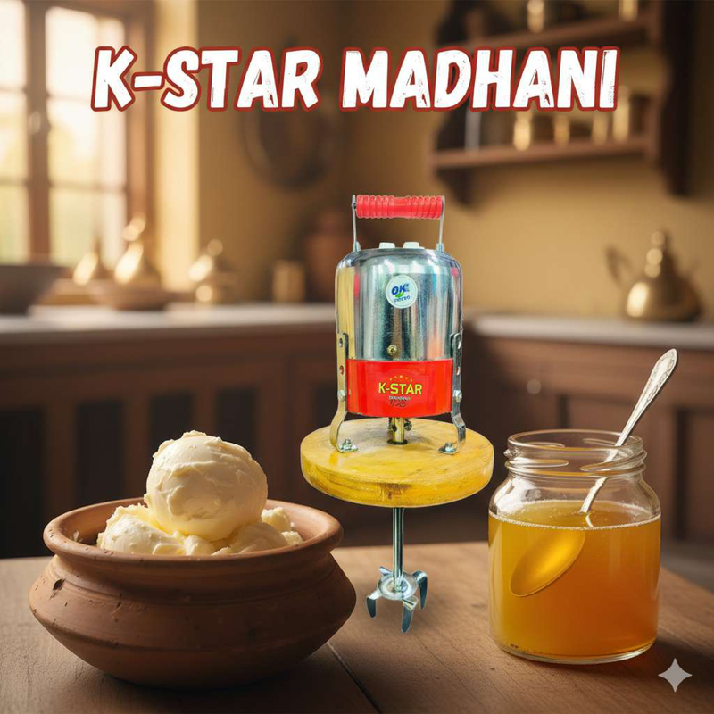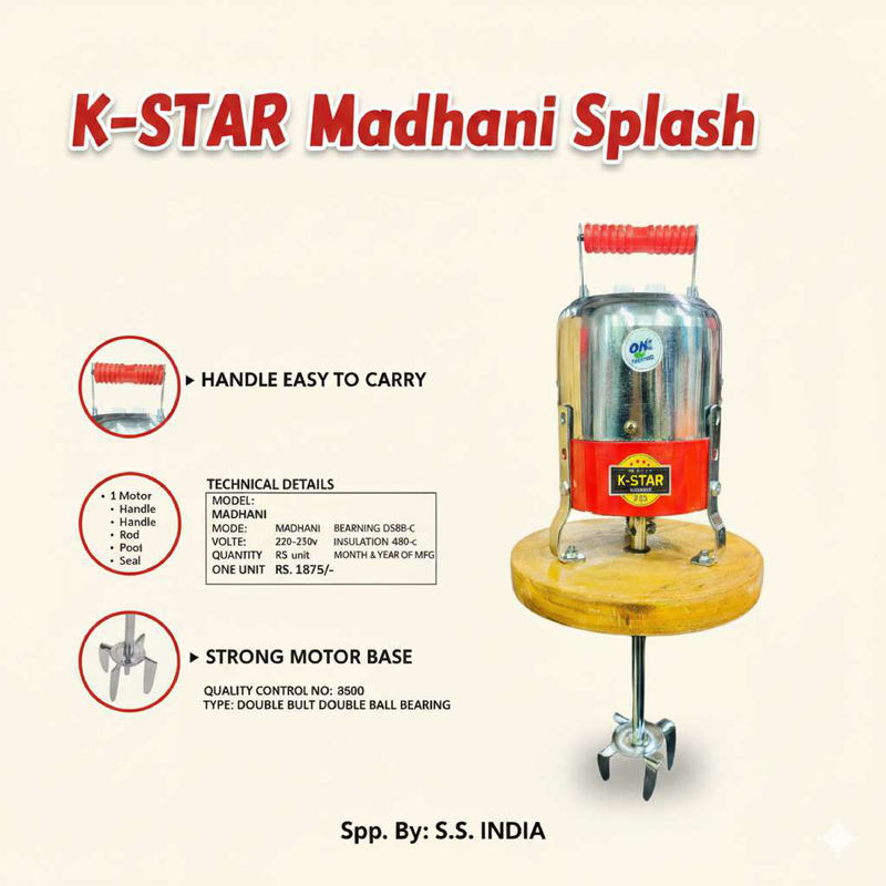 The K-STAR Madhani Splash is a powerful and reliable electric butter churner designed for smooth and efficient daily use. Equipped with a heavy-duty motor, it ensures consistent performance while churning butter or curd with ease. Its strong build quality and balanced design make it suitable for both home and commercial kitchens. The machine is engineered to deliver durability, low vibration, and long-lasting performance, making it a trusted choice for traditional dairy preparation.
