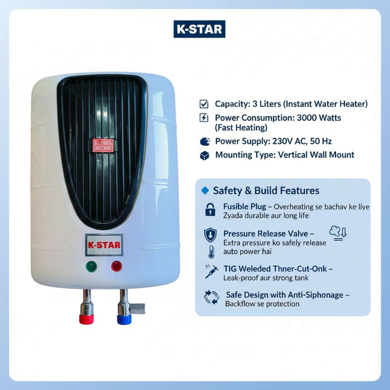 Instant Water Heater (3 Litres) is a compact and efficient water heating solution designed for modern homes, kitchens, and bathrooms. Powered by a 3000W high-performance heating element, it delivers hot water within seconds for quick and convenient use.