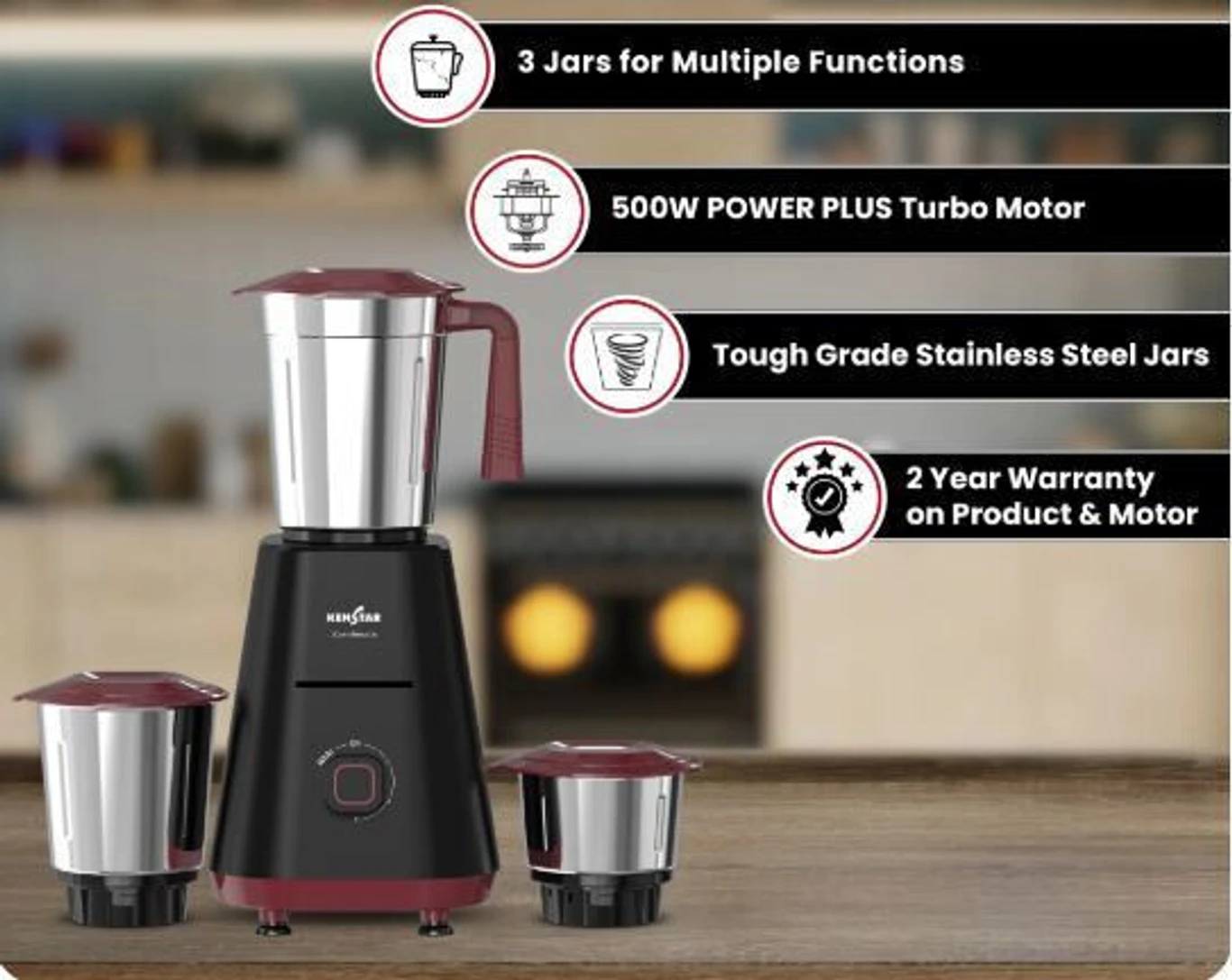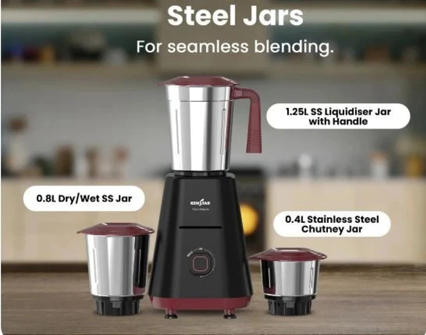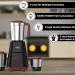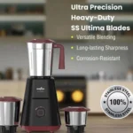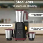 Versatile Jars: Comes with a set of tough-grade stainless steel jars, including a 1.25L liquidiser, 0.8L dry/wet grinder, and 0.4L chutney jar.