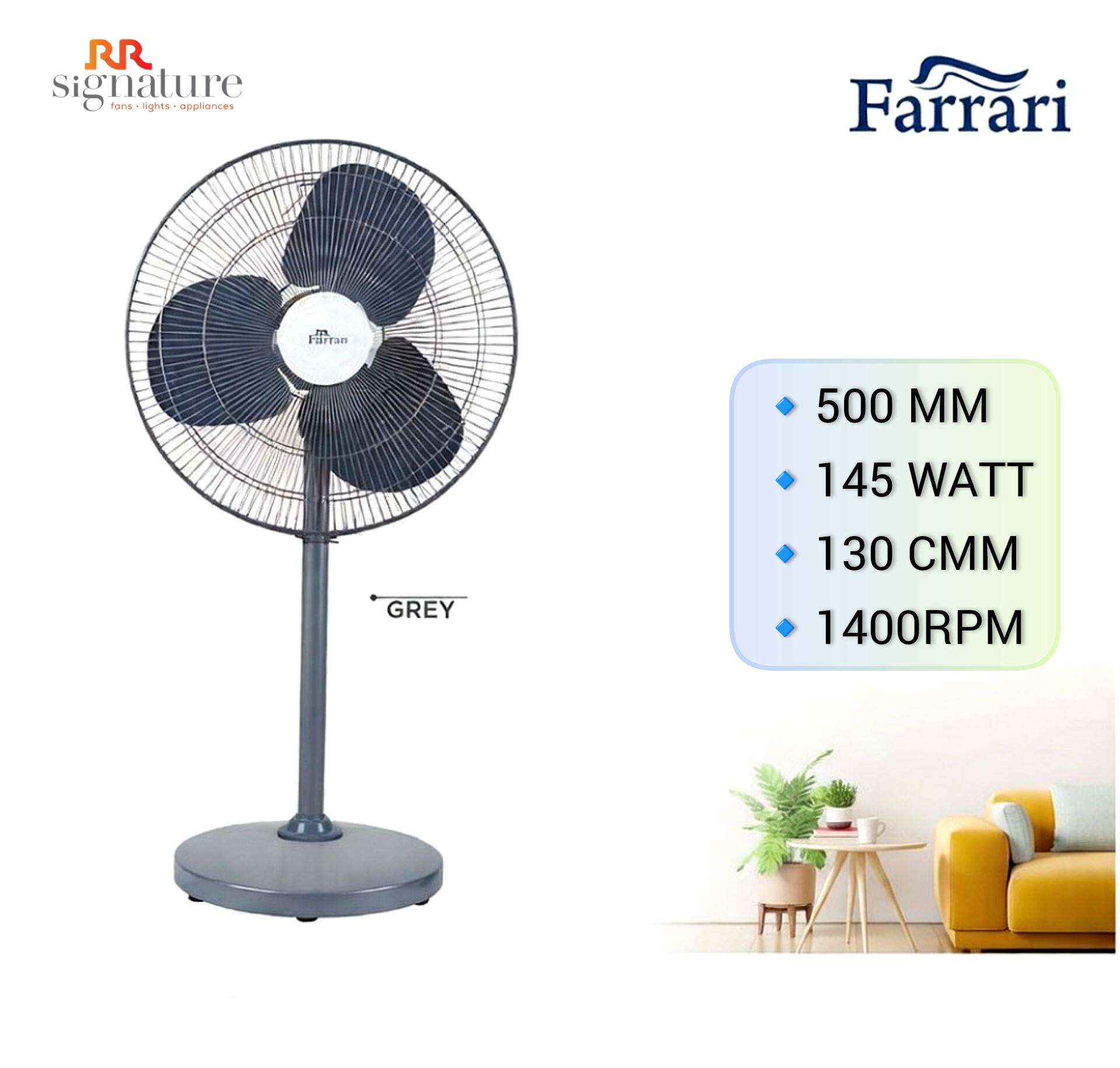 Be the first to review “RR Signature FARRARI Pedestal Fan Grey 500 mm Sweep 1400 RPM”