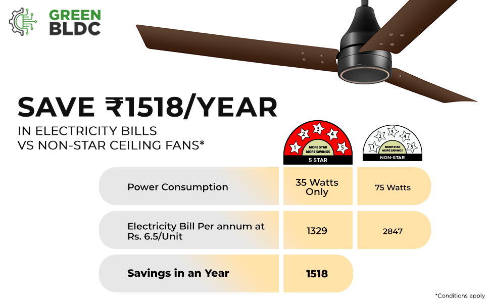 - 5-STAR ENERGY SAVINGS: 35-watt BLDC ceiling fan, delivering efficient and cost-effective cooling.