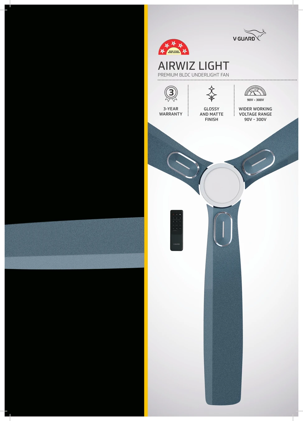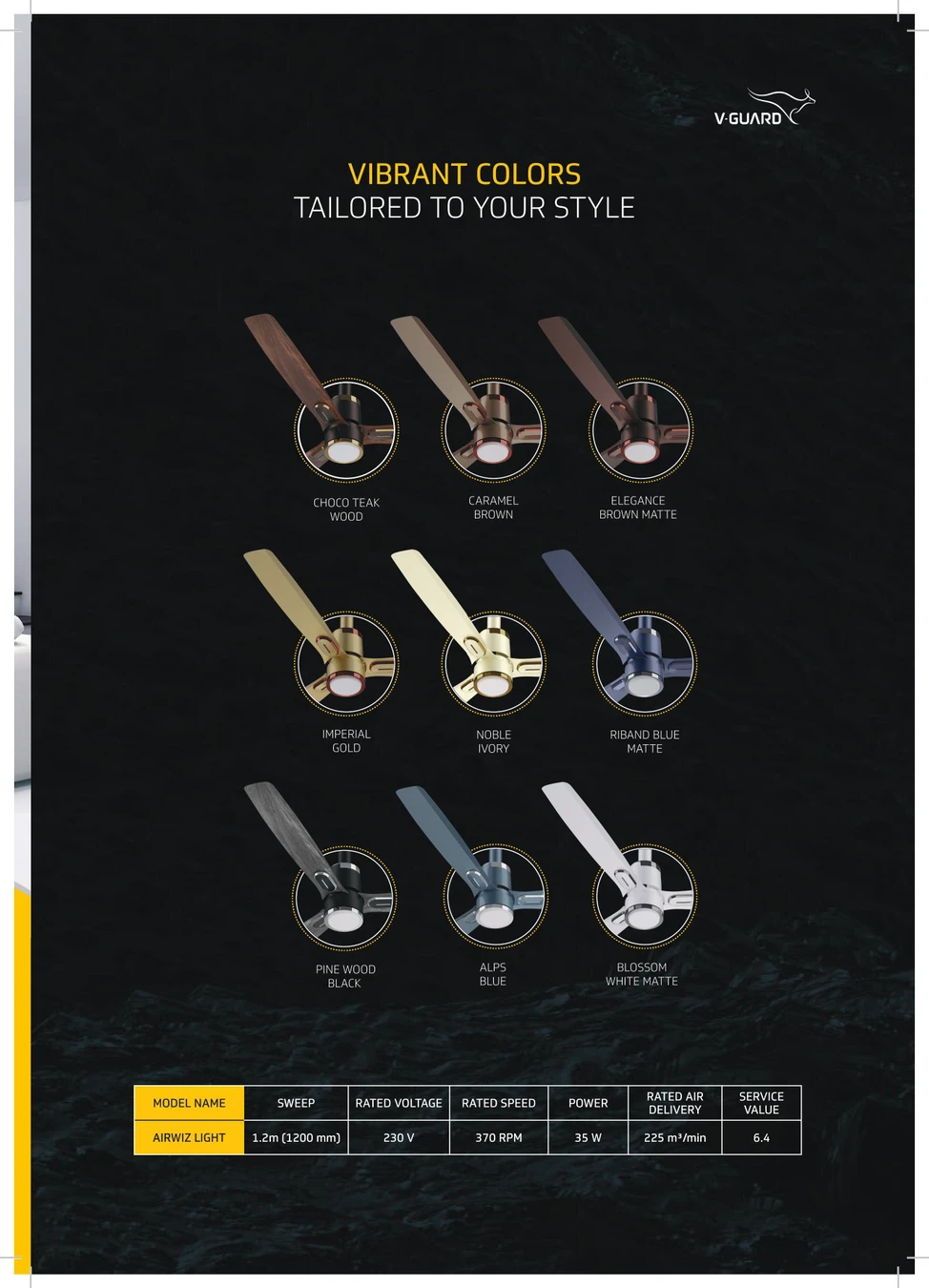 What if your ceiling fan could set the mood? Not just with a gentle breeze, but with a soft, ambient glow that fills the room like moonlight on a quiet night. Presenting Airwiz Light, a range of high-speed premium BLDC underlight fans from V-Guard. The 6W LED underlight brings soft, ambient glow that fills the room like moonlight on a quiet night. Whether you’re winding down after a long day or setting the tone for a cozy evening, this fan doesn’t just move air—it moves . But beauty is just the beginning. Beneath its stylish surface, Airwiz Light powers up to a swift 370 RPM, delivering a strong and steady air flow of 225 m³/min. All this, while consuming just 35W of energy. So while your eyes enjoy the charm of its glow, your body feels the instant comfort of a cool, wide-reaching breeze. Thanks to its wide working voltage range (90V–300V), Airwiz Light remains unfazed by fluctuations, delivering consistent performance even in challenging power conditions. Control, as always, stays in your hands with precision speed settings, a user-friendly interface, and a sleek remote that places comfort at your fingertips. Need a rush of air? Hit Boost. Want to mimic nature’s rhythm? Switch