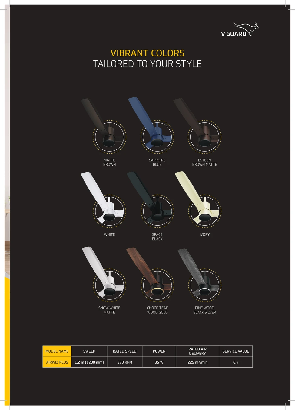 V-guard brings you AIRWIZ PLUS BLDC fans. Let’s get to know more about this hero. With just 35W of power consumption, a sweep of 1200 mm, and an impressive air delivery of 225 m³/min, it’s built to fit perfectly into your lifestyle, elevating your comfort. Spinning at a speed of 370 RPM, AIRWIZ PLUS ensures fast and effective comfort the moment you need it. Even if your area experiences voltage fluctuations, this fan doesn’t flinch. Its wide operating voltage range of 90V to 300V ensures that the performance remains stable. The fine speed settings let you control the breeze to suit your mood, whether you’re working, relaxing, or trying to sleep. And since it comes with a remote, there’s no need to get up or search for the regulator anymore. The reverse flow mode is a clever feature designed for colder months. When using a room heater, this mode helps recirculate the warm air trapped near the ceiling, ensuring even warmth across the space. Add to this the selection of smart modes like Boost for instant power, Breeze for a natural wind feel, and Sleep for quieter, slower operation, and it becomes a fan that understands your routine. Built-in timer settings of 4 and 8 hours add another layer of convenience, allowing you to switch off the fan, ideal for uninterrupted sleep or power saving through the night. AIRWIZ PLUS also stands out with a tasteful blend of gloss and matte surface finishes, giving it an understated elegance that complements any room décor. But it’s not just about looks—this premium coating resists both dust and corrosion, ensuring longevity and easy upkeep. The double-shielded ball bearings offer smooth, reliable performance over years of use. Available in 6 colour variants, it’s easy to find a tone that complements your interiors beautifully. And for added confidence, the fan is backed by a solid 3-year warranty. What more are you looking for? Bring home the AIRWIZ PLUS today and embrace the soothing breeze!
